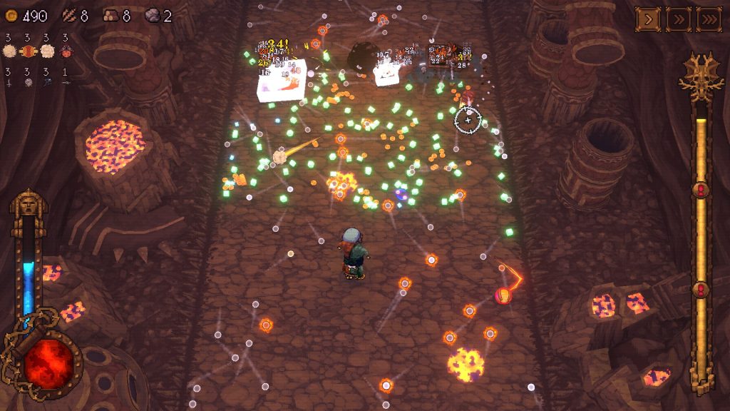 Without any kind of narrative, the game focuses on the essentials: reaching the final level of the massive pit that gives it its name. Split into eight distinct biomes, the player faces enemies of various forms and behaviors, alternating between melee and ranged attacks. Positioned at the bottom of the screen, your goal is simple yet relentless, destroy everything before it reaches you. When enemies do, damage is inevitable, which encourages a fast-paced, almost hypnotic rhythm blending precision, reflex, and improvisation.